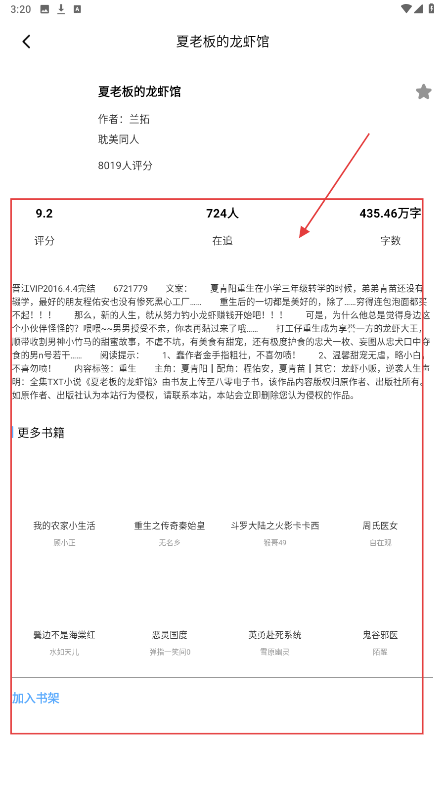 4、在小说详情页面,可查看小说的评分、在追人数、字数等信息,还可查看【更多书籍】推荐,点击【加入书架】,可将小说加入书架。