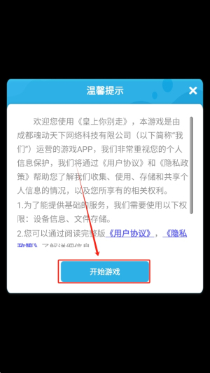 1、同意协议:点击“开始游戏”按钮,同意用户协议和隐私政策,开始游戏。