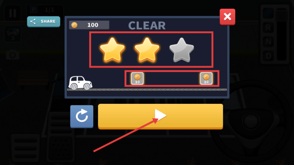 4、完成停车任务后,可根据获得的星级评价获取对应金币奖励,点击相关按钮可继续游戏。