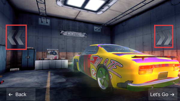 1、在车库界面,可通过左右箭头【<<】【>>】切换查看不同车辆,选择心仪车辆后点击【Let'sGo】开启游戏。