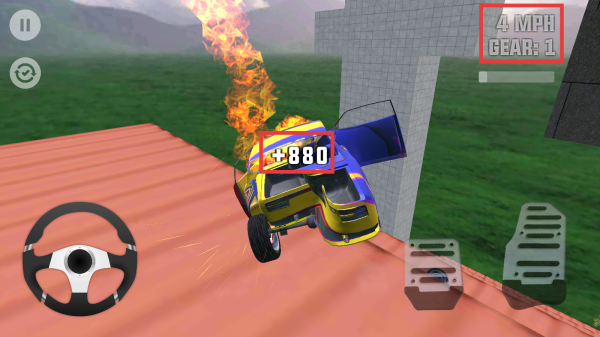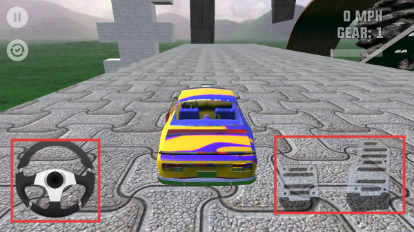 3、驾驶过程中,使用左下角方向盘控制方向,右下角踏板控制加速减速,留意屏幕显示的速度【MPH】和挡位【GEAR】。