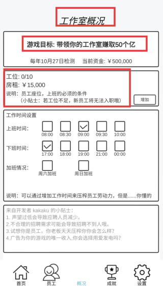 3、明确【游戏目标:带领你的工作室赚取50个亿】,关注【工位】情况,当前0/10,工位不足新员工无法入职,可按需点击【增加】。