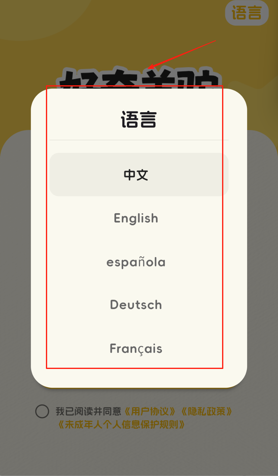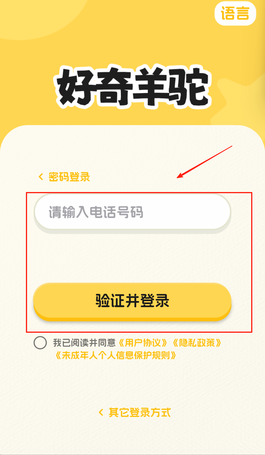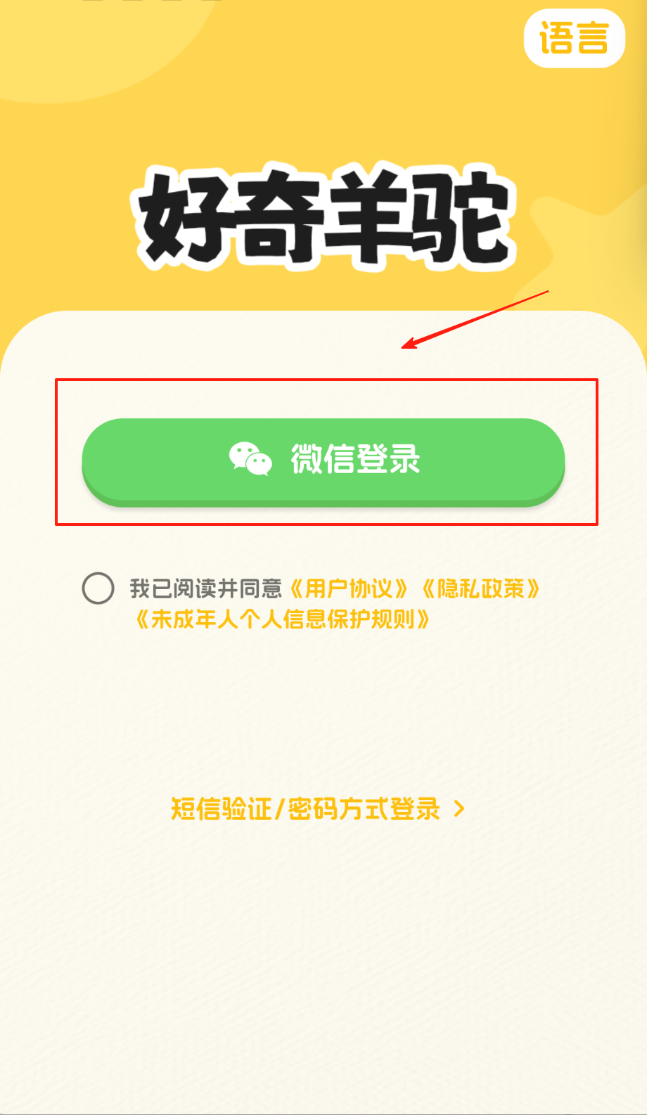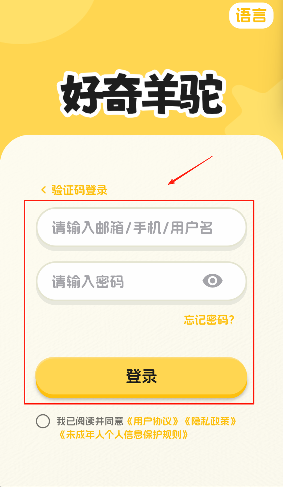 1、打开应用看黄色界面的登录页,顶部有"好奇羊驼"标题,右上角语言按钮可选中文或英文,根据提示选择适合的登录方式呀。