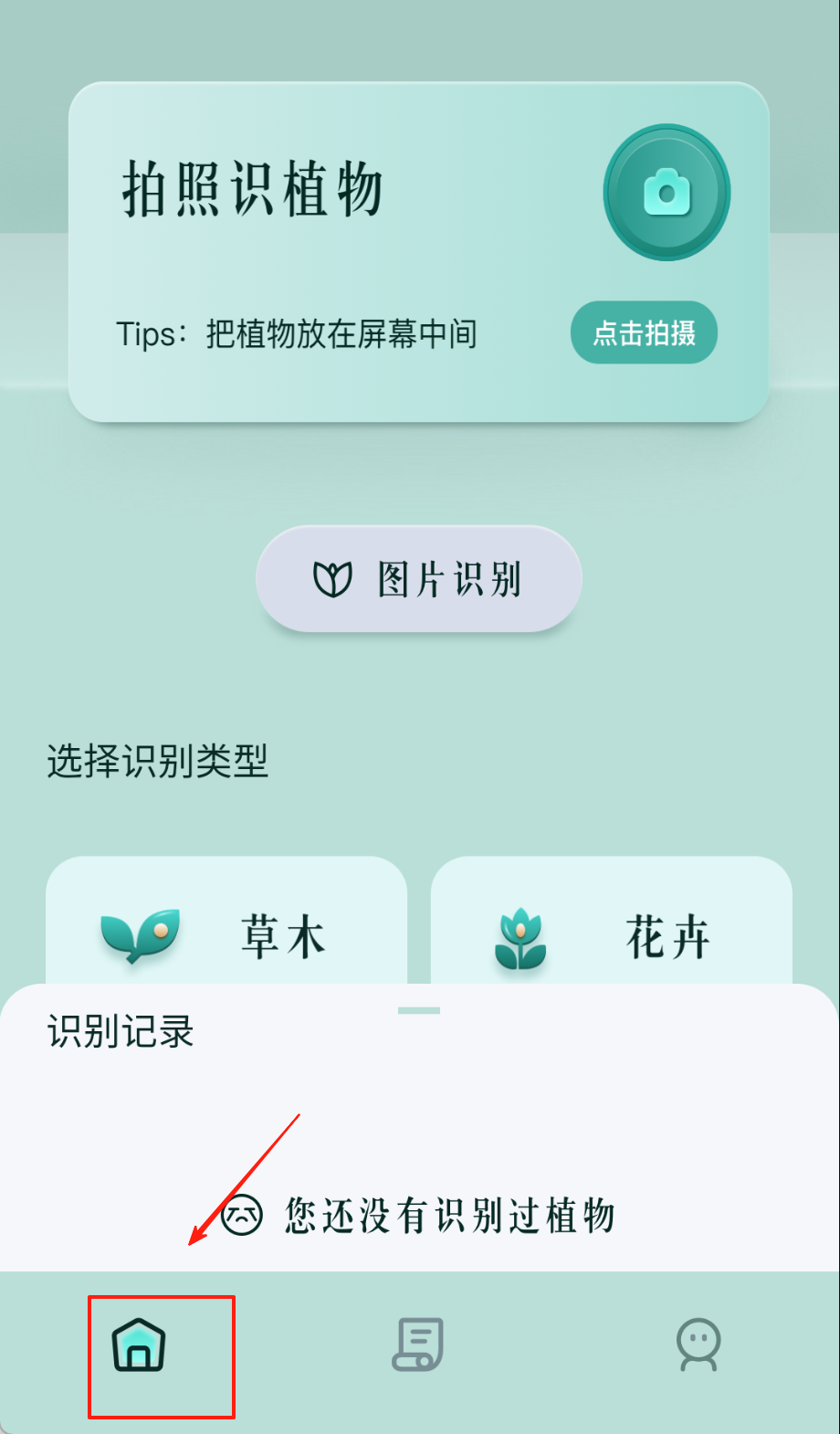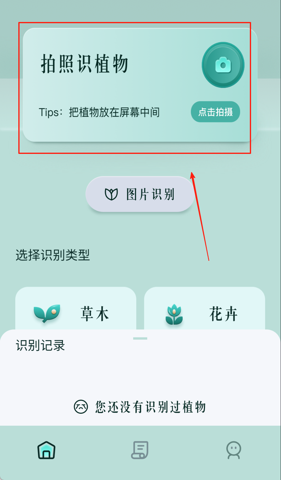 1、首页点"拍照识别"对准植物,红点标注新功能提醒,调整拍摄角度,确保画面清晰完整哦。