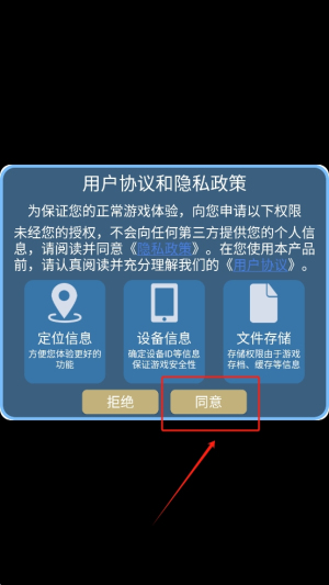 1、同意隐私政策:阅读并同意用户协议和隐私政策,点击“同意”进入游戏。