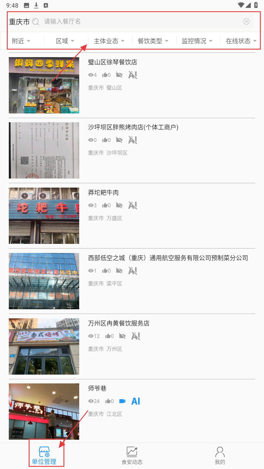 1、打开APP进入【单位管理】页面,上方有搜索栏可搜餐厅,还有【附近】【区域】等筛选条件,列表展示餐厅信息,包括名称、情况等。