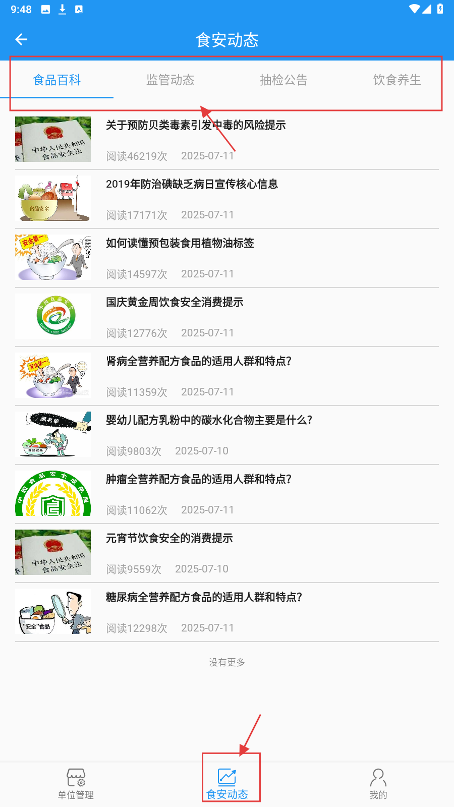 2、点击底部【食安动态】,进入食安动态页面,这里有【食品百科】【监管动态】【抽检公告】【饮食养生】等分类标签,可查看相关资讯。