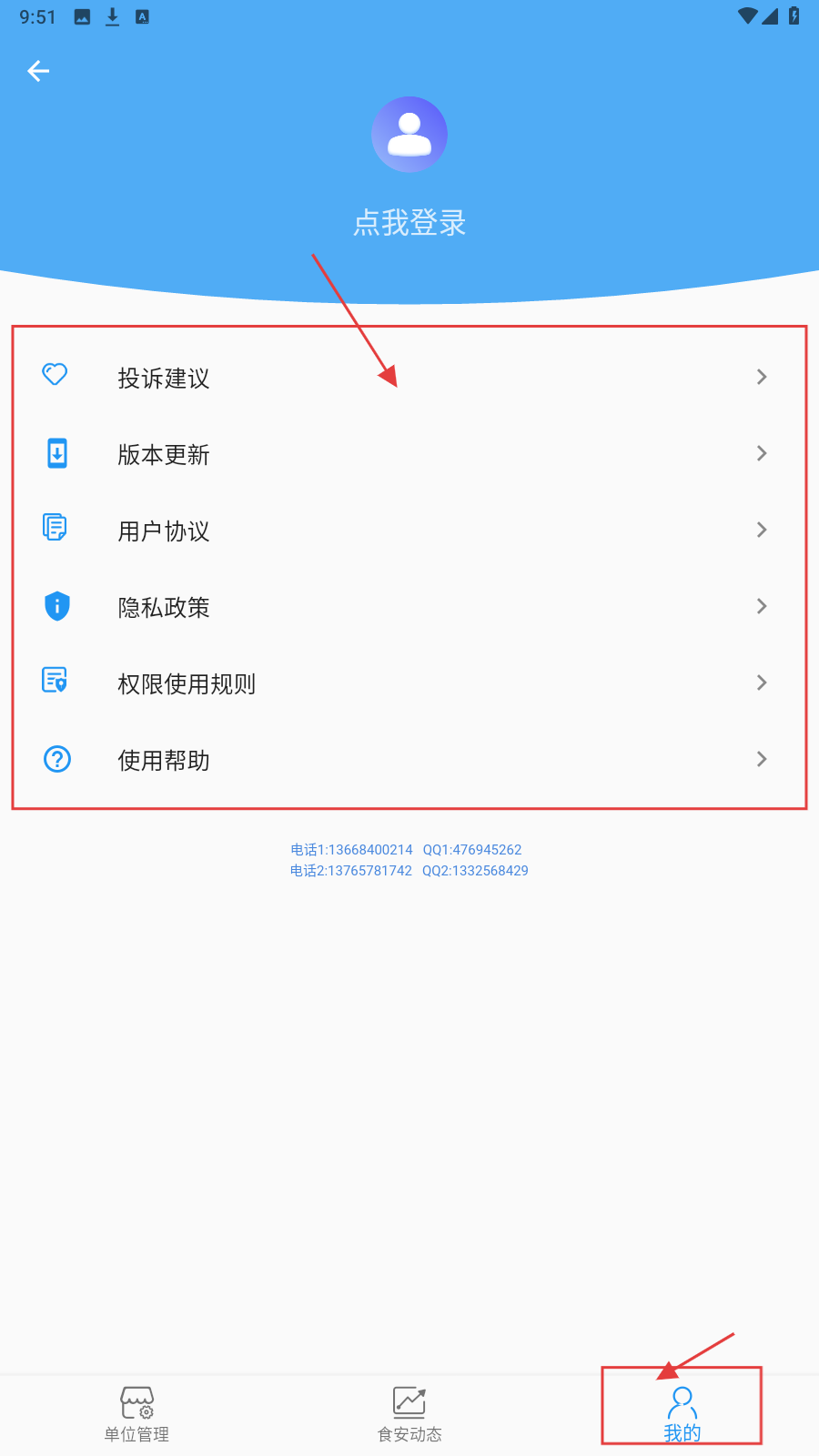 4、点击底部【我的】,进入个人中心页面,可进行【投诉建议】【版本更新】【用户协议】等操作,还可查看联系方式。