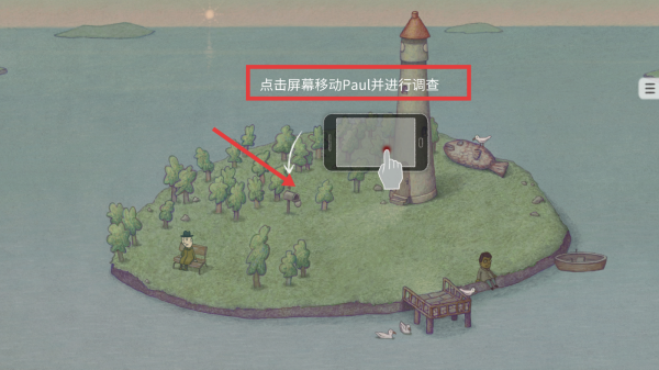 1、按照提示【点击屏幕移动Paul并进行调查】,探索岛屿场景,寻找关键线索。