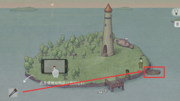 4、根据“点击或拖动物品以使用它们”提示,对场景物品如【小船】等进行互动,触发新剧情,进入下一场景。