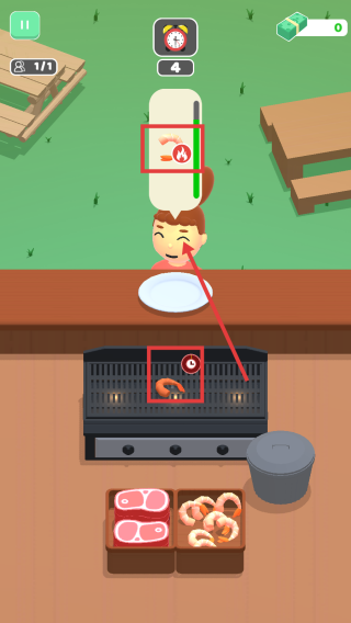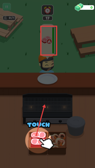 2、按照“TOUCH”提示,快速点击选择食材放置到烤架上烤制,留意顾客需求进度条,及时调整烤制状态。