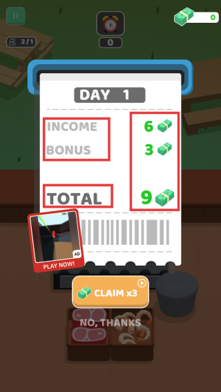 4、完成顾客服务后,查看收益界面的【INCOME】【BONUS】和【TOTAL】,积累资金,可选择点击“CLAIMx3”获取更多奖励。