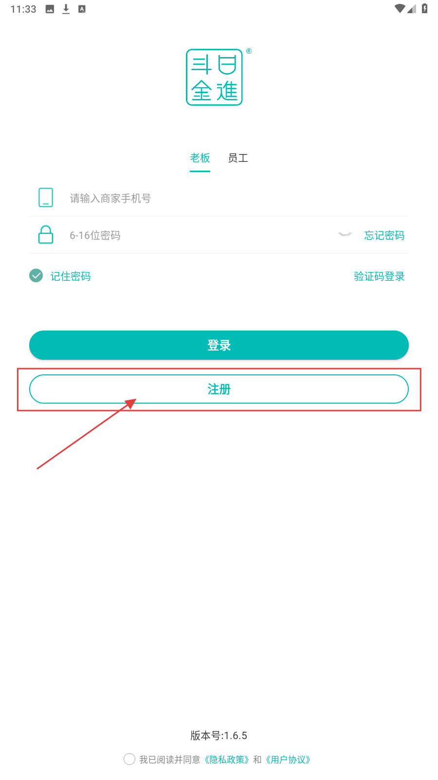 1、进入“日进斗金服装”登录页,点击下方【注册】按钮。
