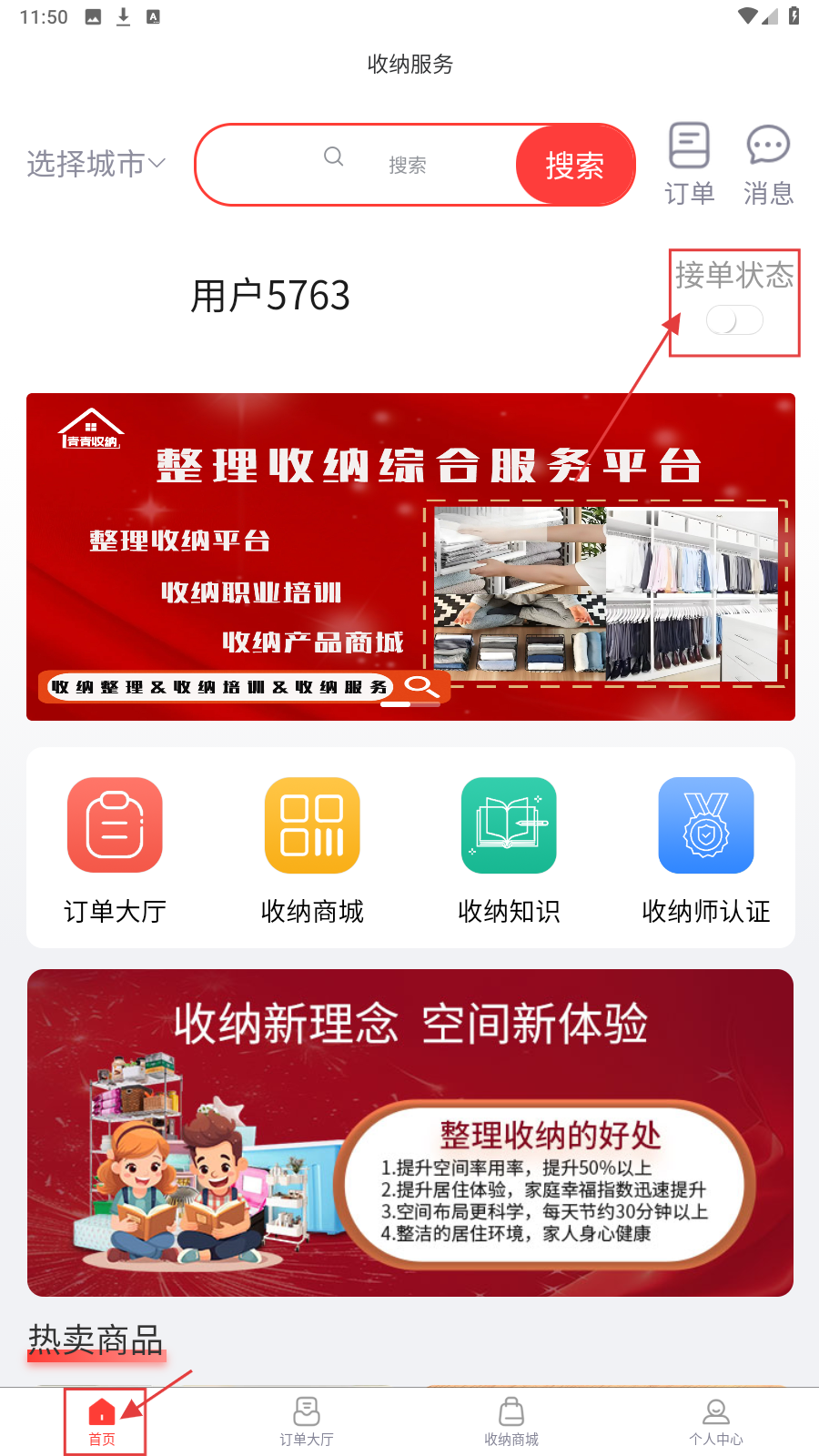 1、打开“青青收纳师”软件,在【首页】点击右侧的【接单状态】开启接单按钮。
