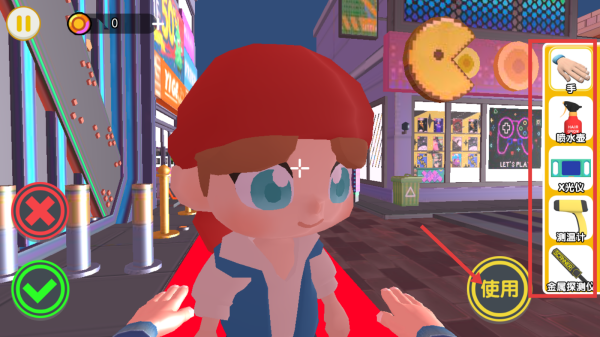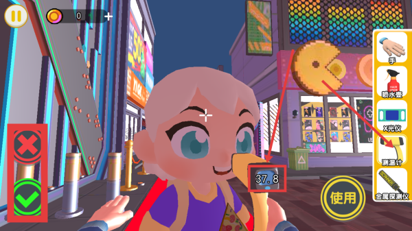 1、利用右侧工具栏的【手】、【喷水壶】、【X光仪】、【测温计】、【金属探测仪】等工具对人物进行检查。