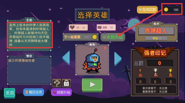 1、了解“炸弹超人”的技能,主动技能是投掷三枚手榴弹并释放大爆炸,被动技能可减少炸弹爆破伤害。积累金币点击提升英雄属性。