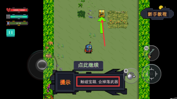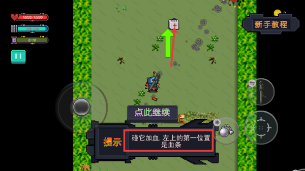 3、遇到宝箱时,操控英雄触碰,会掉落武器,增强战斗能力,看到血包时,及时触碰,可恢复左上血条显示的生命值。