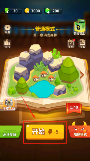 2、开始游戏并进入战斗场景。点击“开始”按钮,进入普通模式的第一章地图。