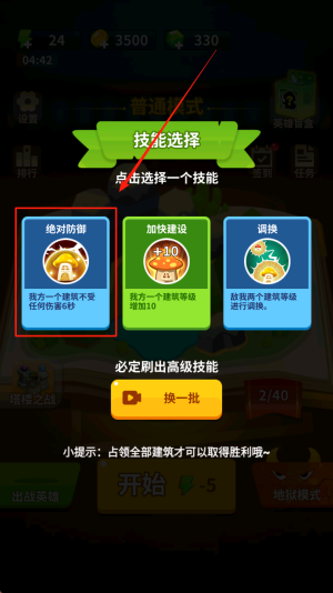 1、选择并升级你的技能。在游戏开始前,通过点击选择一个技能来增强你的防御能力。