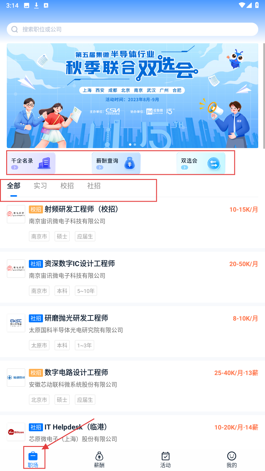 1、打开APP进入【职场】页面,有搜索栏、双选会宣传图,还有【千企名录】【薪酬查询】【双选会】等功能区。