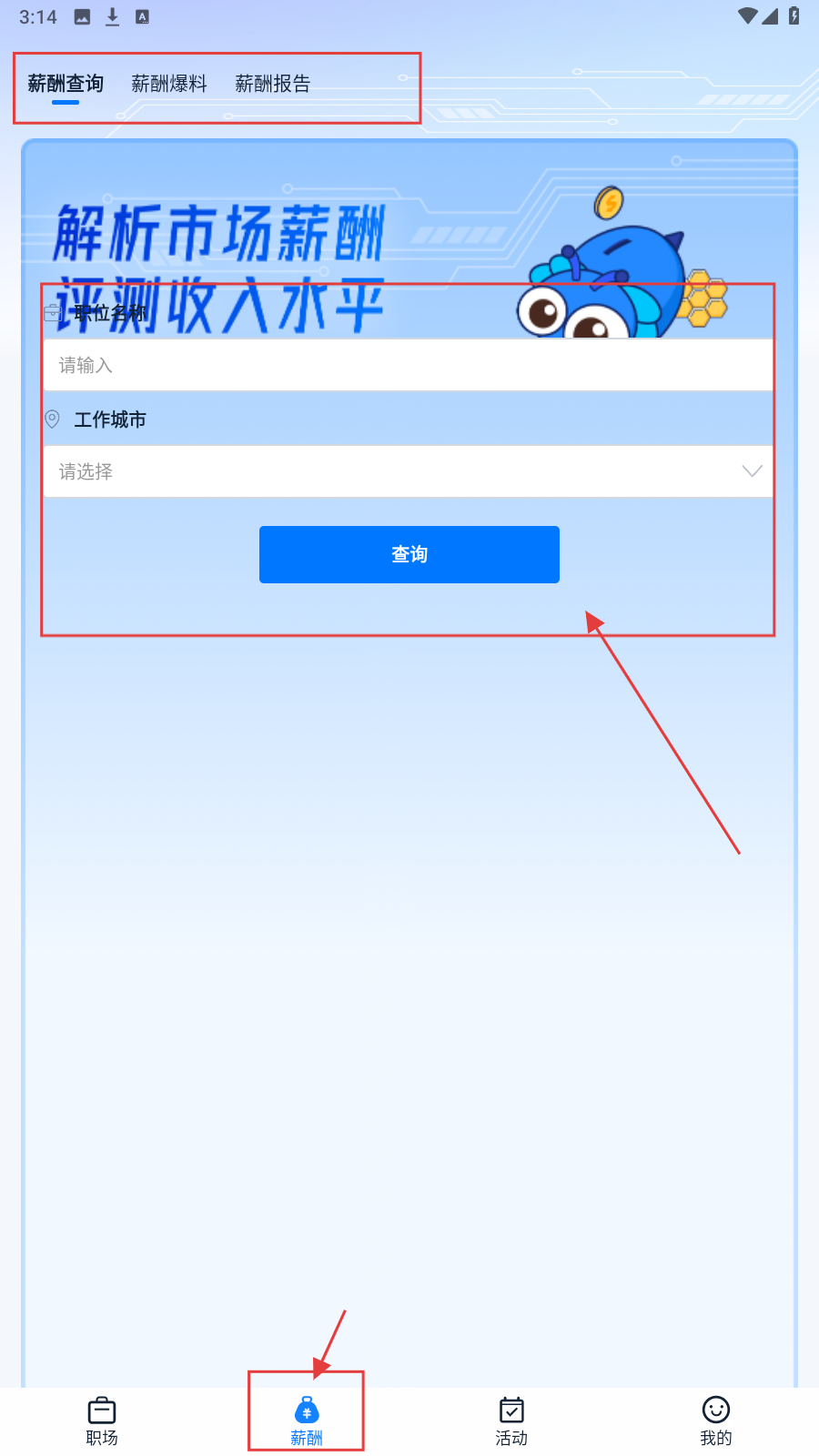 2、点击底部【薪酬】,进入薪酬页面,是【薪酬查询】【薪酬爆料】等标签,填信息后点【查询】,可了解行业薪酬水平。