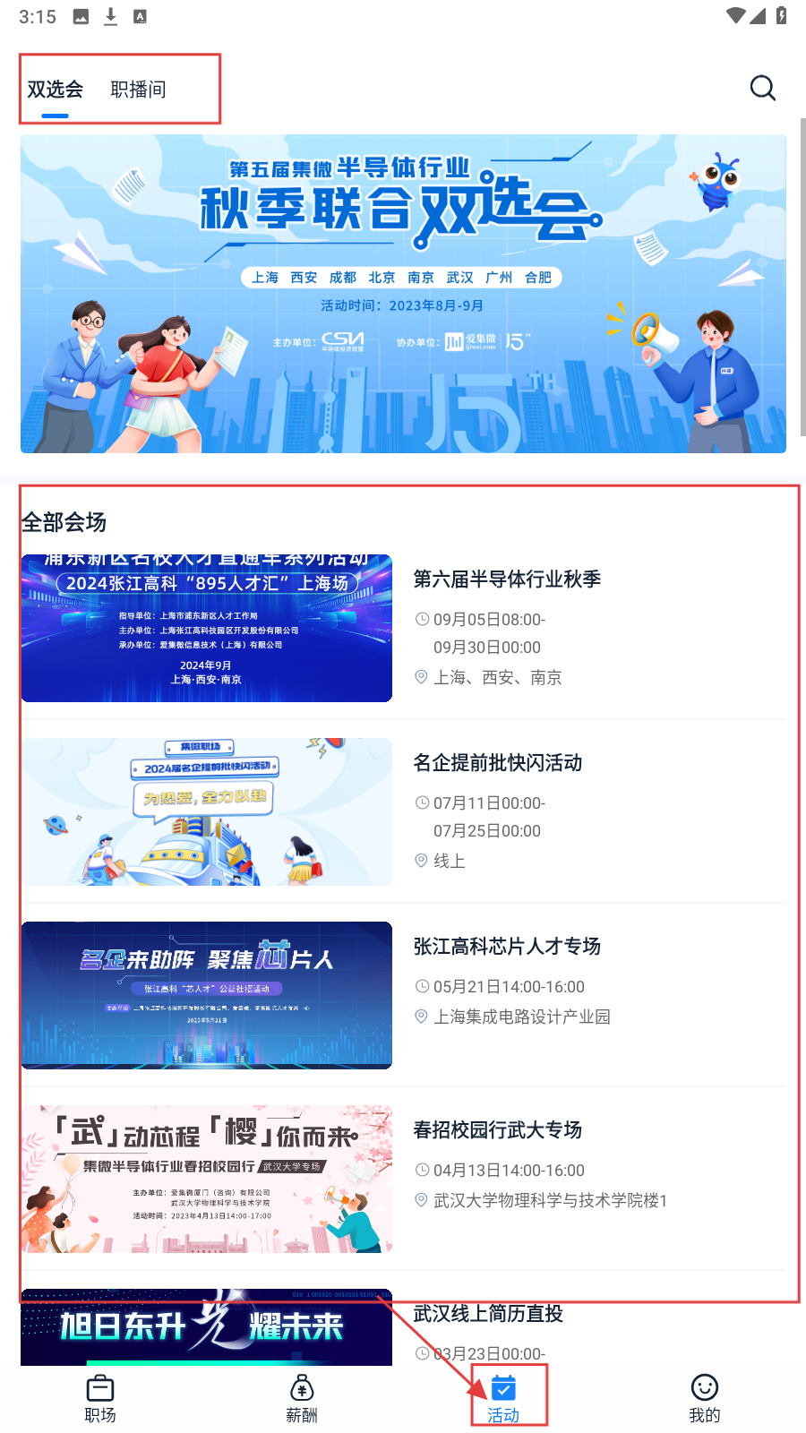 3、点击底部【活动】,进入活动页面,有【双选会】【职播间】等标签,下方是【全部会场】列表,可查看招聘活动信息。
