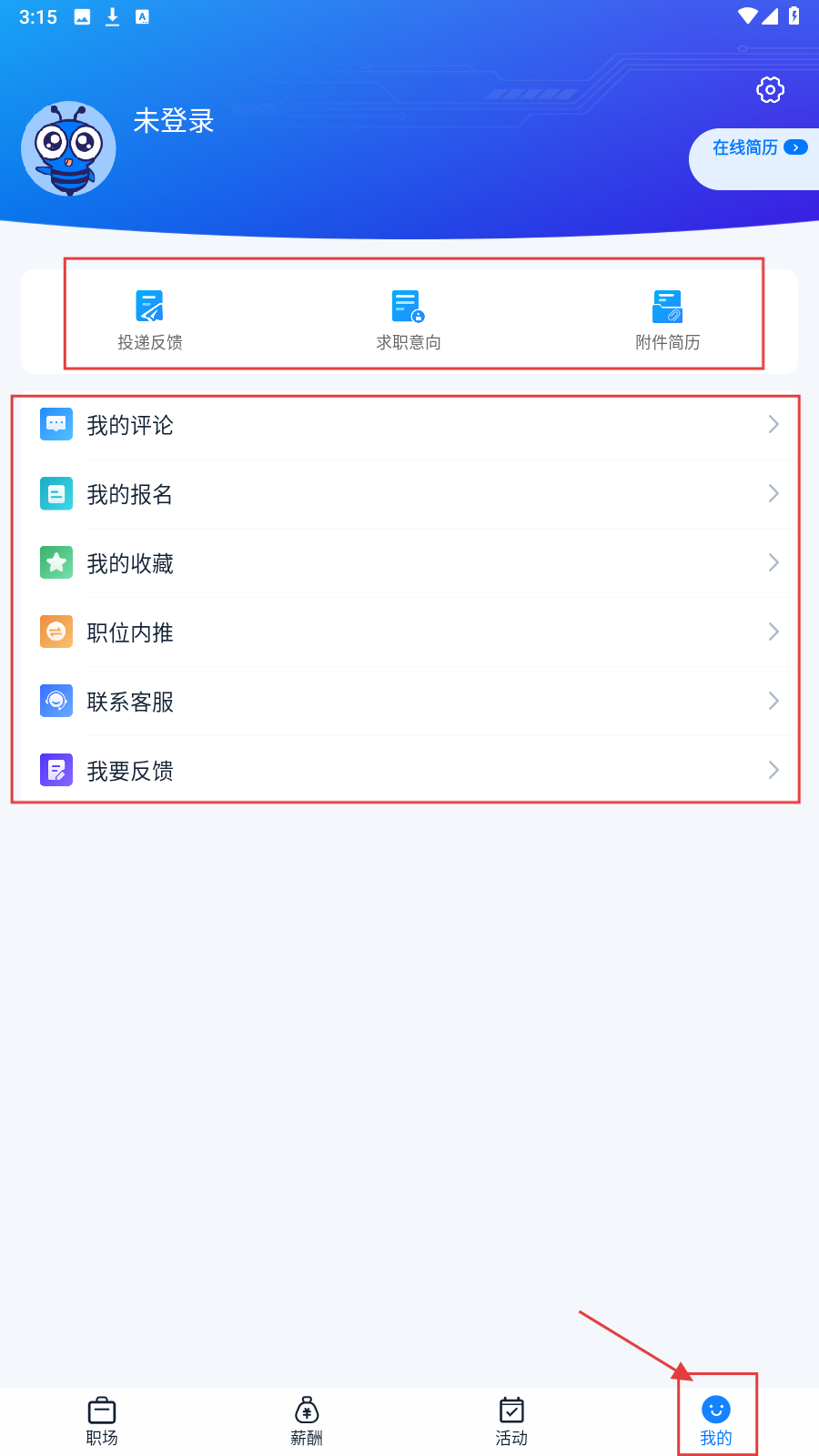 4、点击底部【我的】,进入个人中心,可登录账号,查看【投递反馈】【求职意向】【附件简历】。