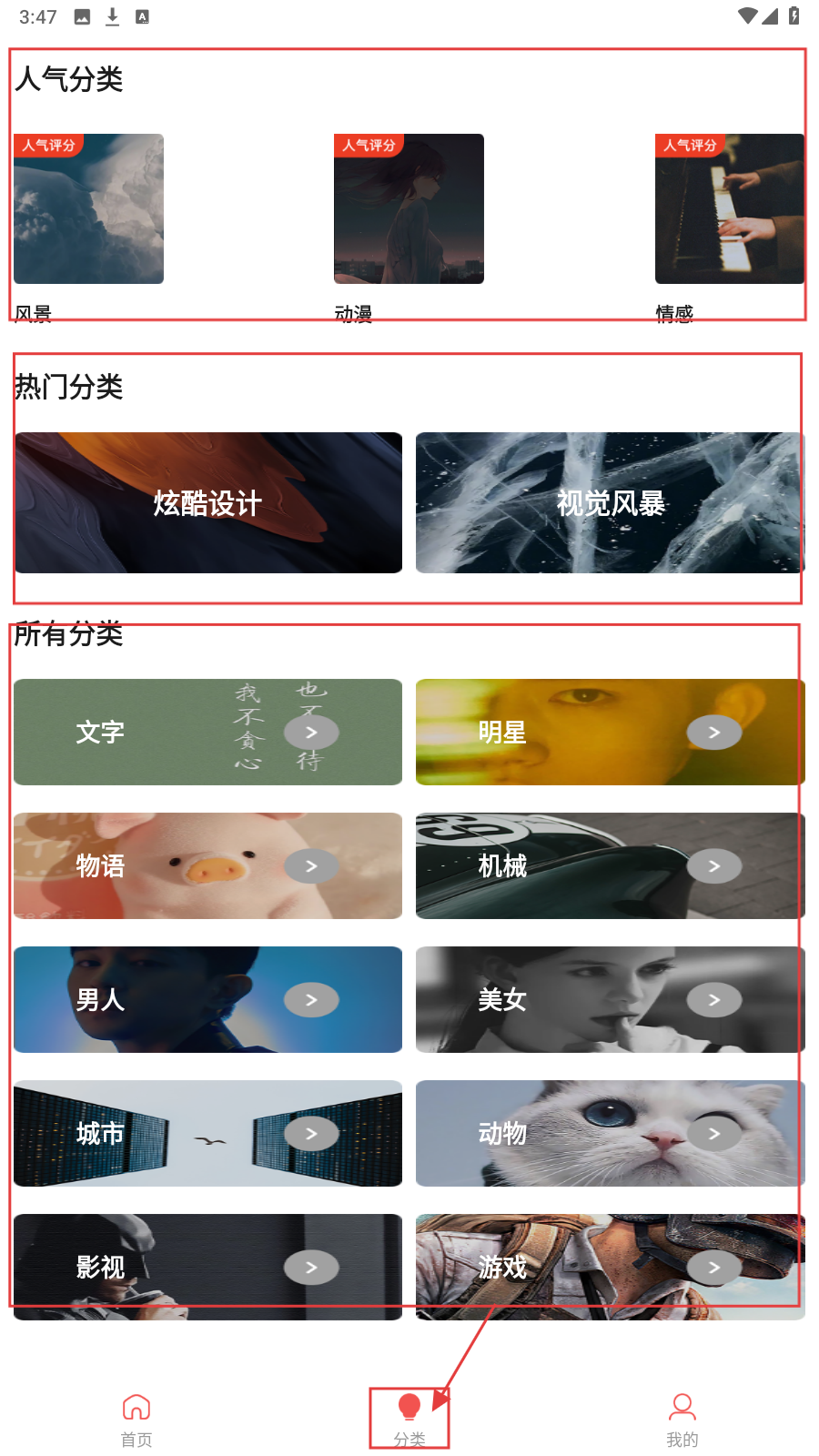 2、进入后,点底部【分类】,有【人气分类】、【热门分类】、【所有分类】,可以选择感兴趣的壁纸分类。