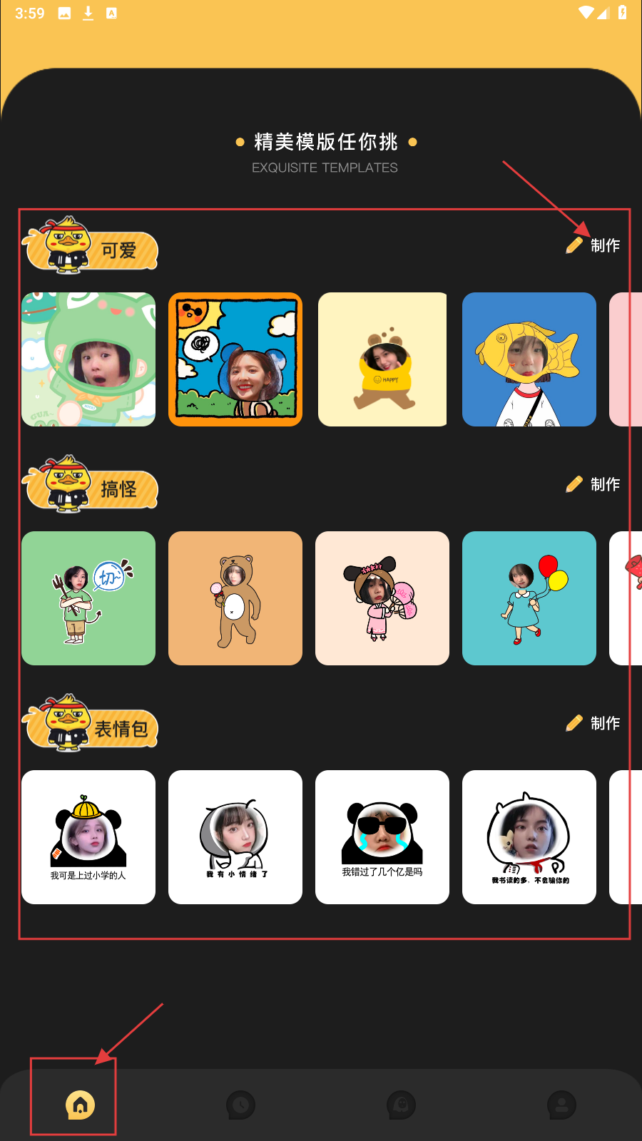 1、点底部【首页】,选【可爱】【搞怪】【表情包】等模板分类,点分类旁【制作】。