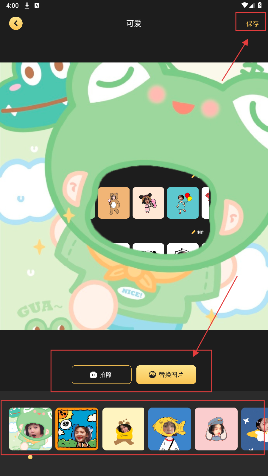 2、进入模板页,点【拍照】或【替换图片】换图,底部选同分类其他模板,做好后点右上角【保存】。