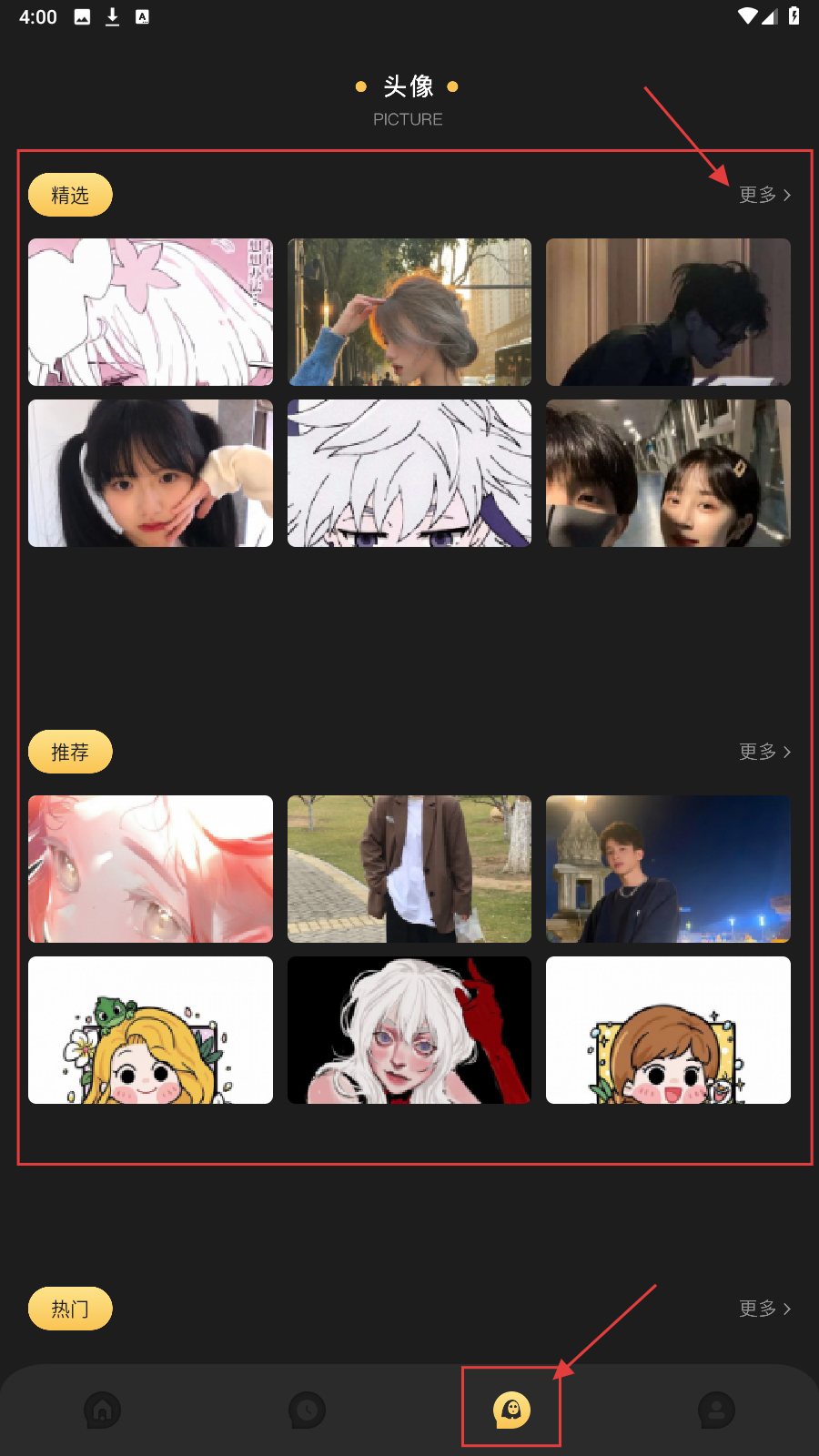 3、点击底部第三个图标,可以查看不同分类的头像,选择喜欢的类型的头像,点击右侧【更多】按钮,进入详情页。