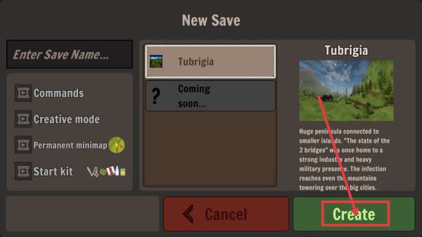 4、在“EnterSaveName...”处输入存档名称,按需勾选“Commands”“Creativemode”等选项,了解“Tubrigia”地图介绍后,点击创建新存档。