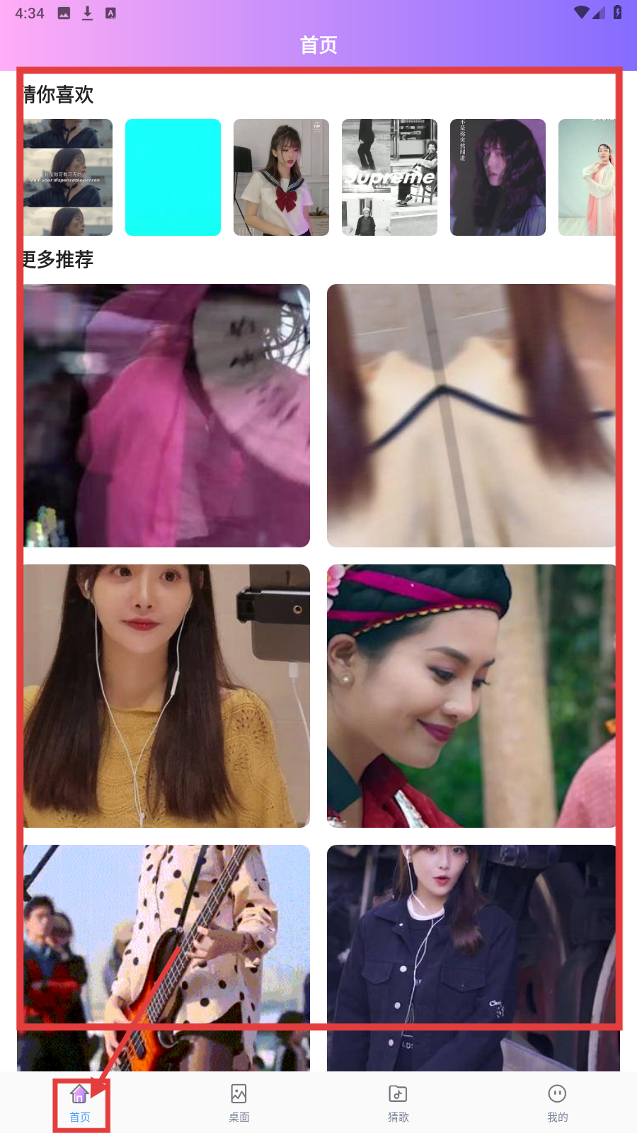 1、打开APP,进入【首页】,页面呈现【猜你喜欢】【更多推荐】板块,展示多样视频素材,点击对应素材进入详情页。