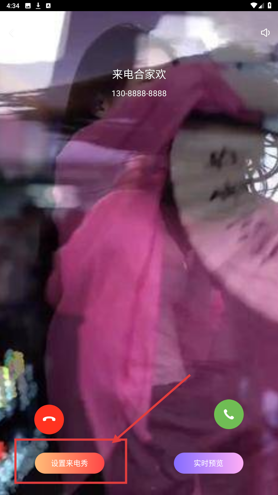 2、在素材详情页,点击【实时预览】,模拟来电时该素材作为来电秀的显示效果。