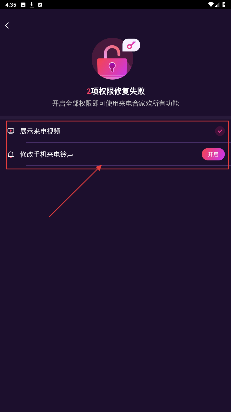4、若弹出【2项权限修复失败】提示,需手动开启【展示来电视频】、【修改手机来电铃声】权限,完成后即可成功设置。
