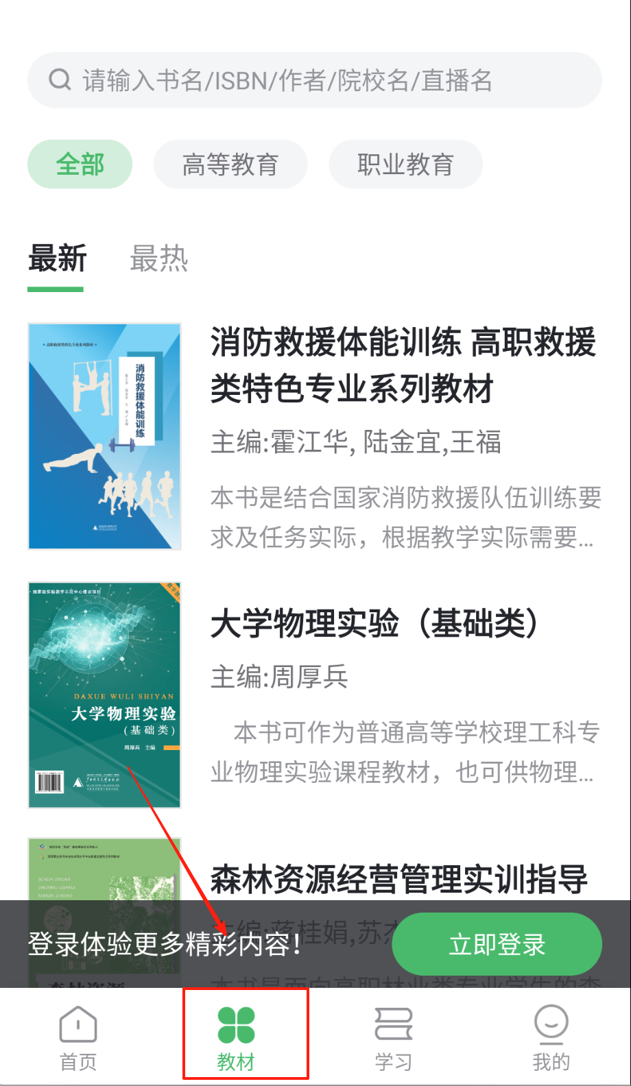 1、首页点"教材库"浏览推荐书目,红点标注新上教材,按学科分类筛选,查看详细简介哦。