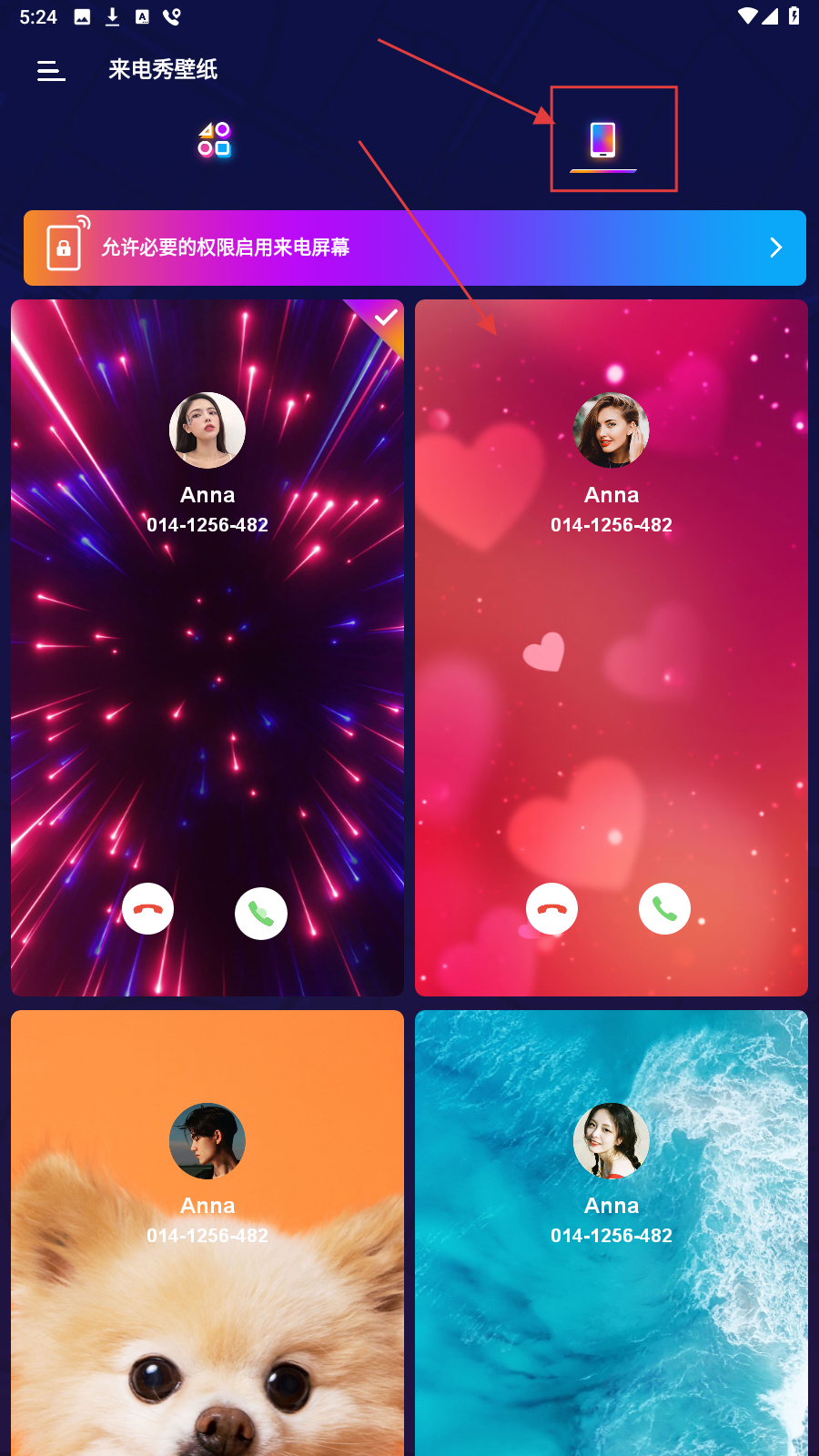 1、在【来电秀壁纸】页,选心仪主题(如爱心、萌宠、风景风格),点进预览。