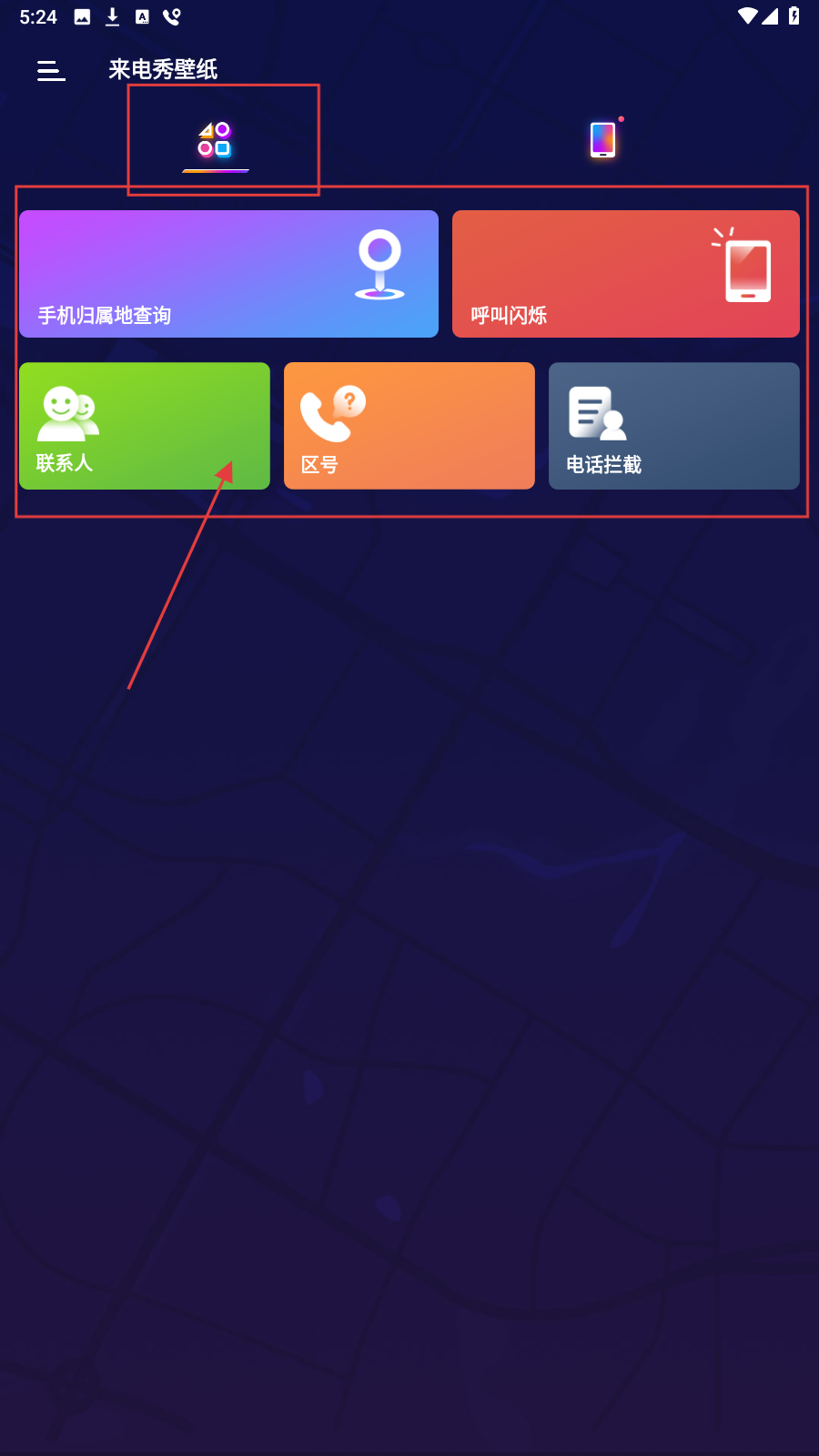 3、切换功能页,用【手机归属地查询】【呼叫闪烁】【联系人】【区号】【电话拦截】等工具。