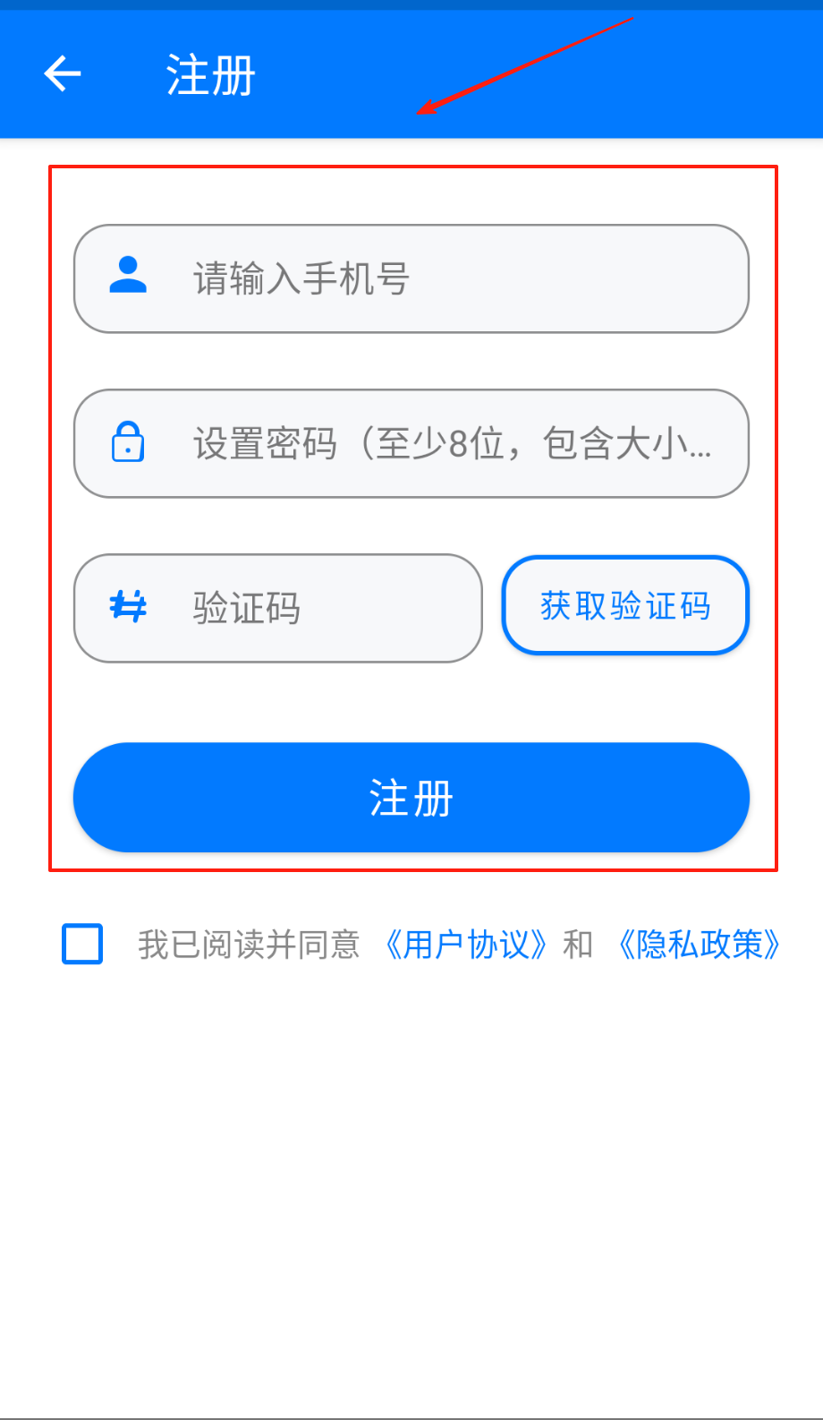 2、注册页填写手机号和密码,密码需8位含大小写,获取短信验证码,勾选协议才能点蓝色注册按钮哦。