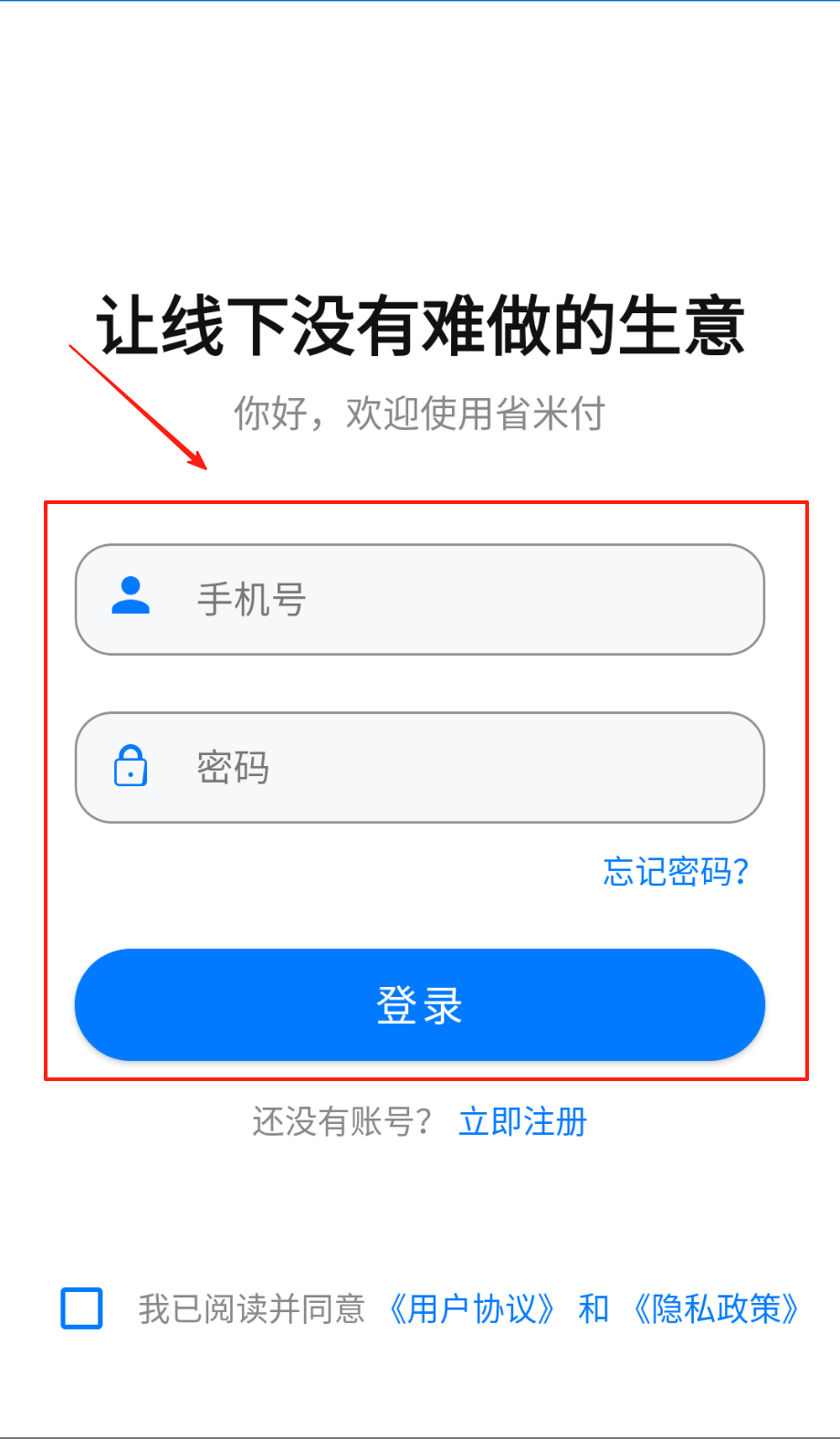 1、打开APP看到蓝色登录界面,顶部有"让线下没有难做的生意"标语,中间是"欢迎使用省米付"的问候语,整体设计简洁呀。