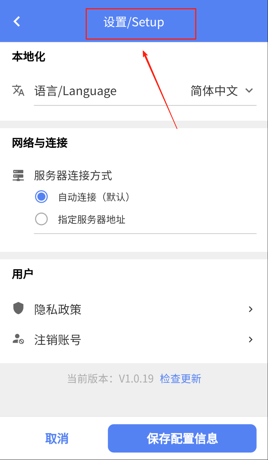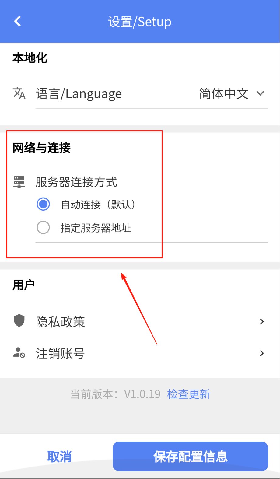 2、网络设置选自动或手动连接服务器,用户区可查看隐私政策,版本更新在底部检查,记得保存配置哦。