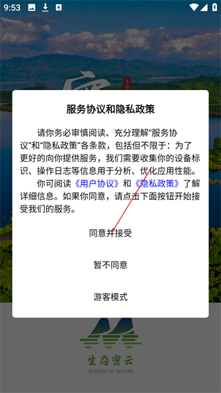 1、在应用启动页,阅读《服务协议和隐私政策》后,点击【同意并接受】按钮,进入应用首页。