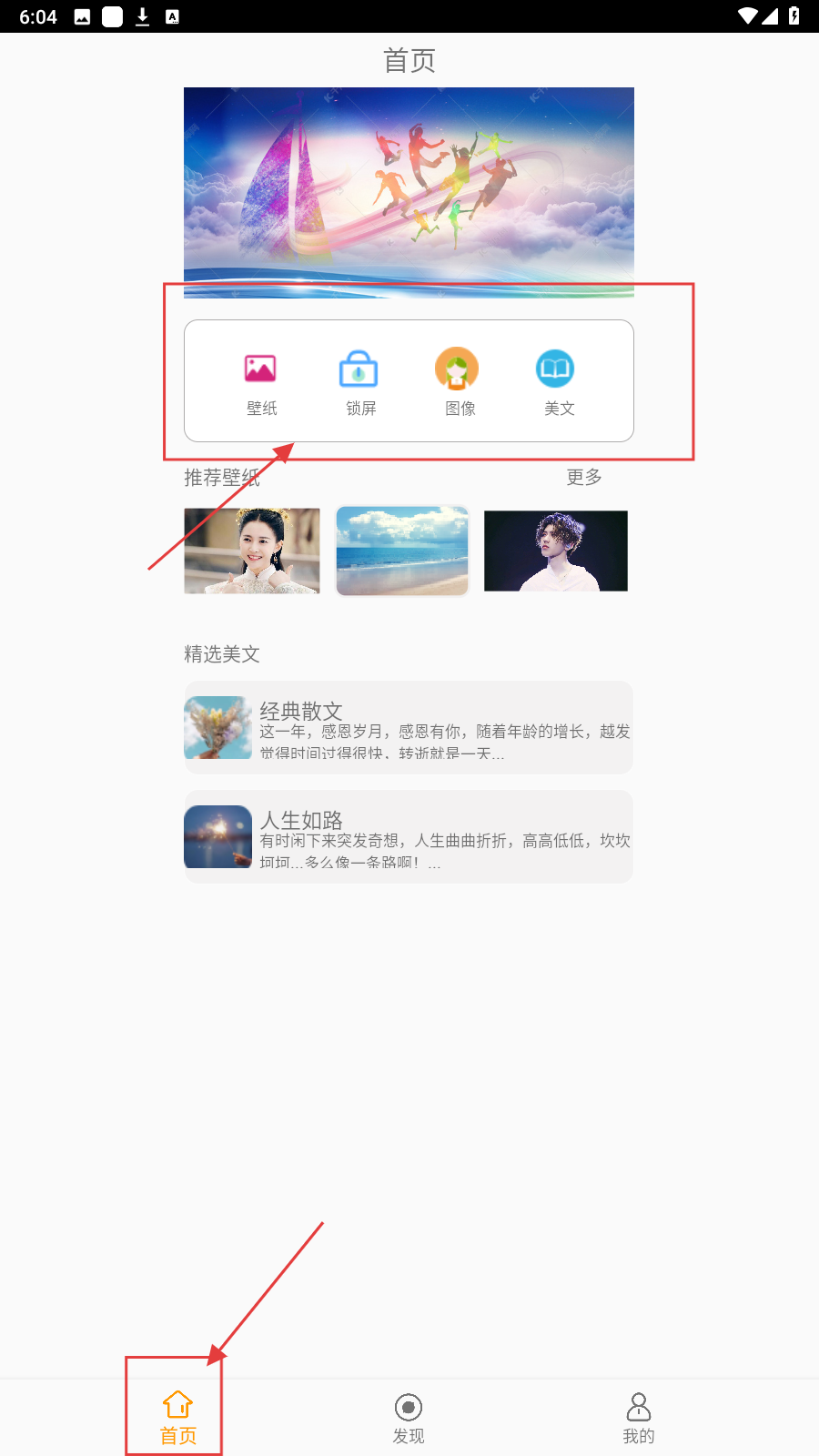 1、在【首页】,能通过【壁纸】【锁屏】【图像】【美文】等功能入口,快速进入对应板块。