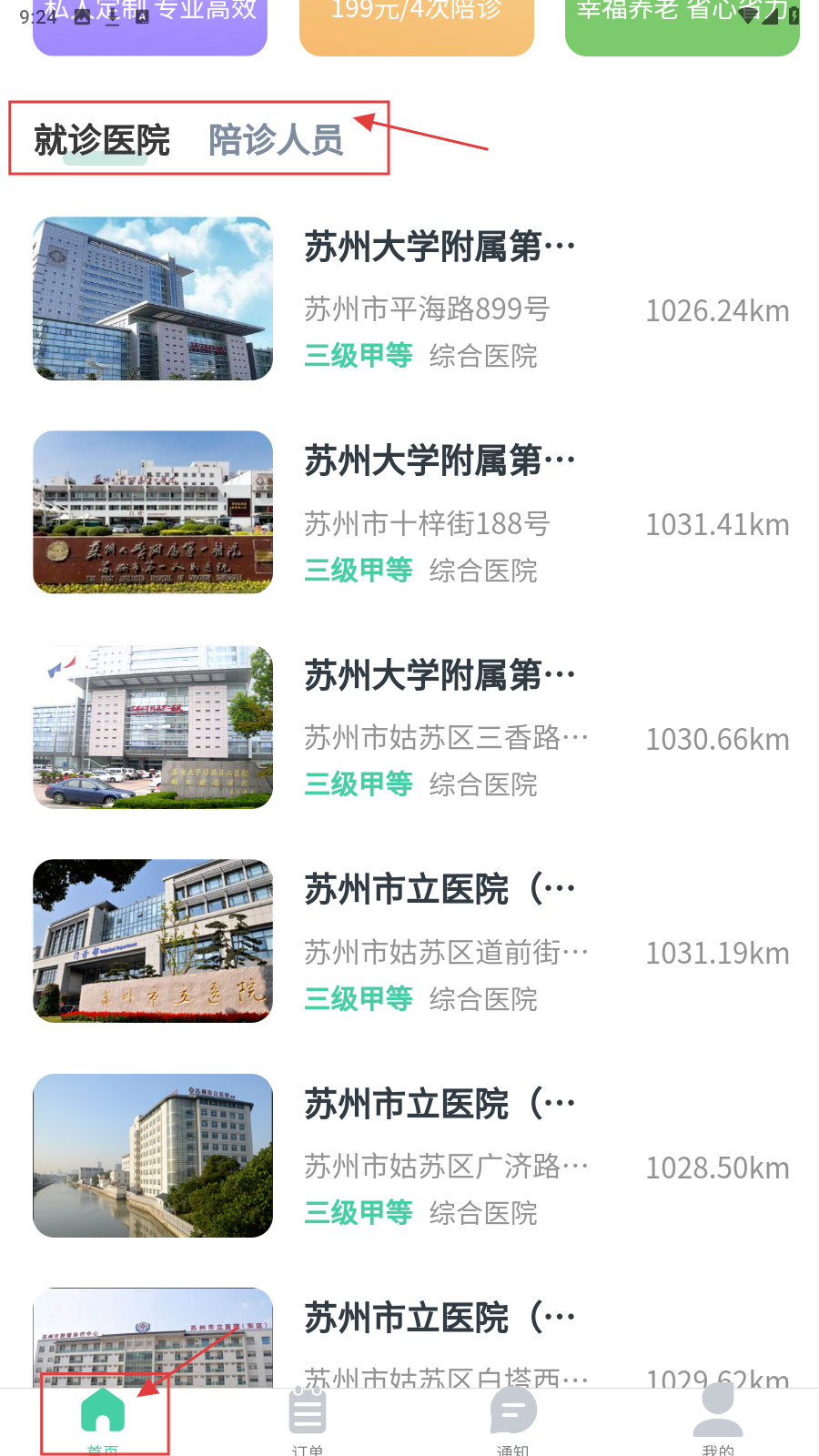 1、进入【首页】后,可看到【就诊医院】和【陪诊人员】选项,点击可查看相关医院及人员信息。