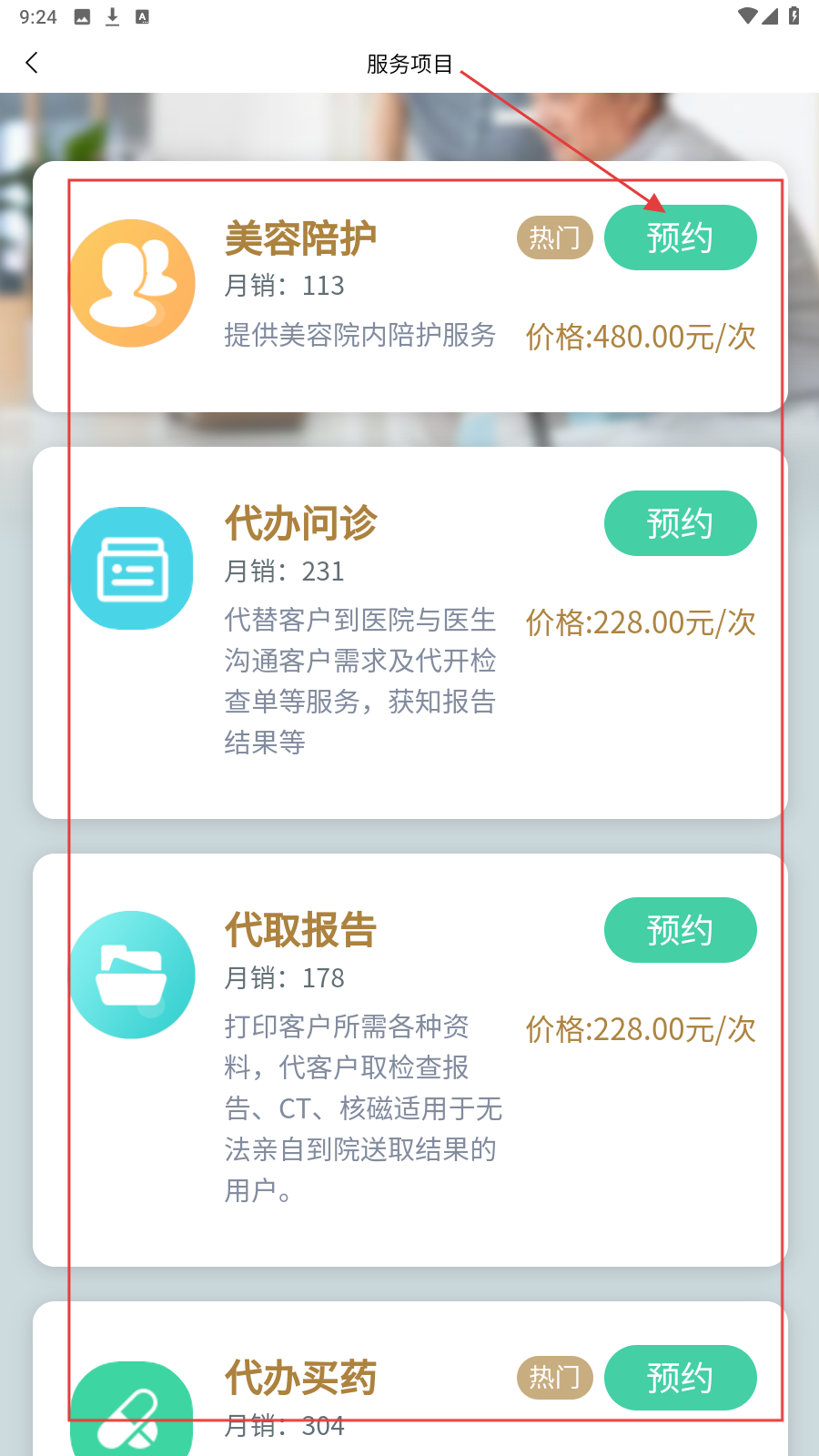 2、在【服务项目】页面,能看到多种服务,如【美容陪护】【代办问诊】等,点击可查看详情。