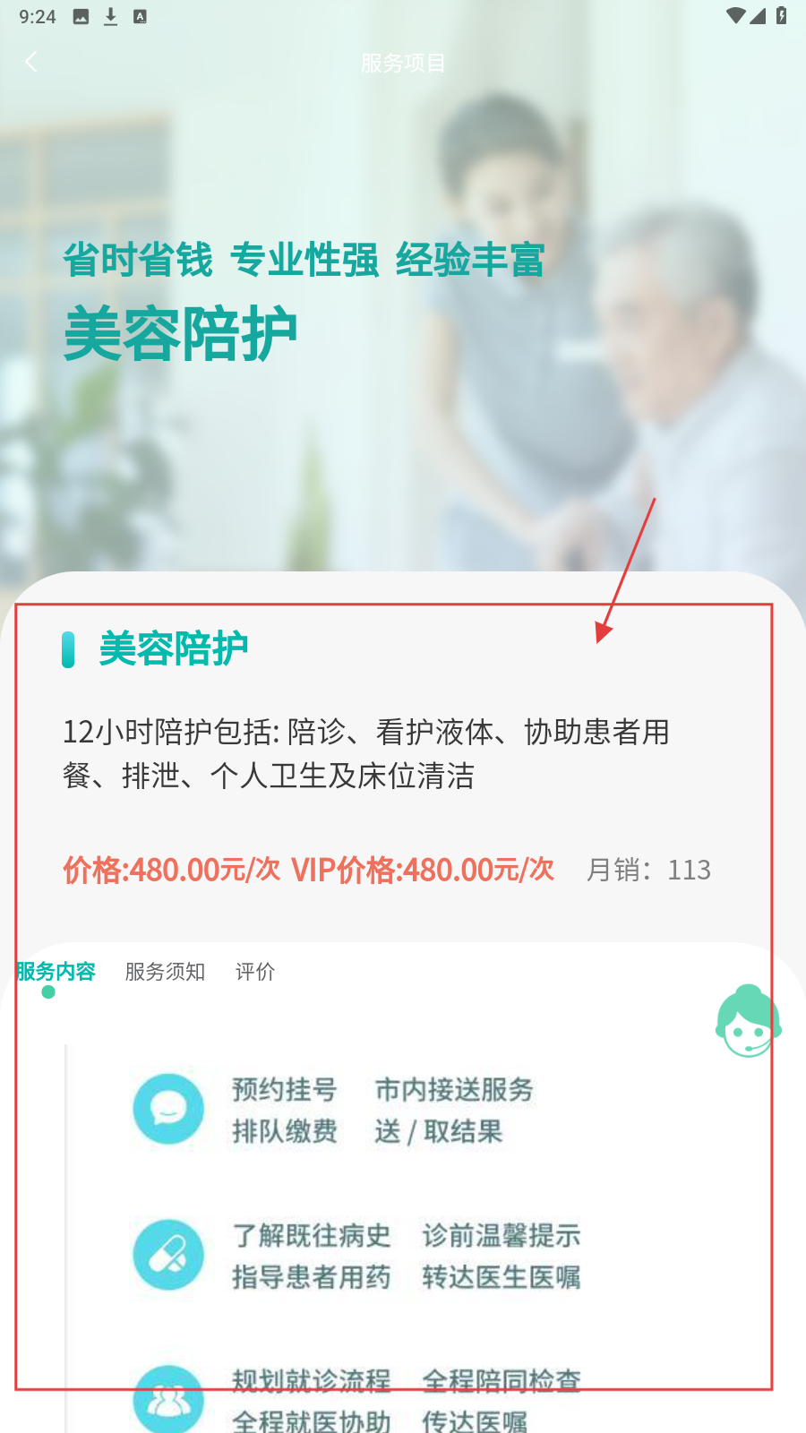 3、点击【美容陪护】,可查看其服务内容、价格等信息,如12小时陪护包含陪诊等多项服务。