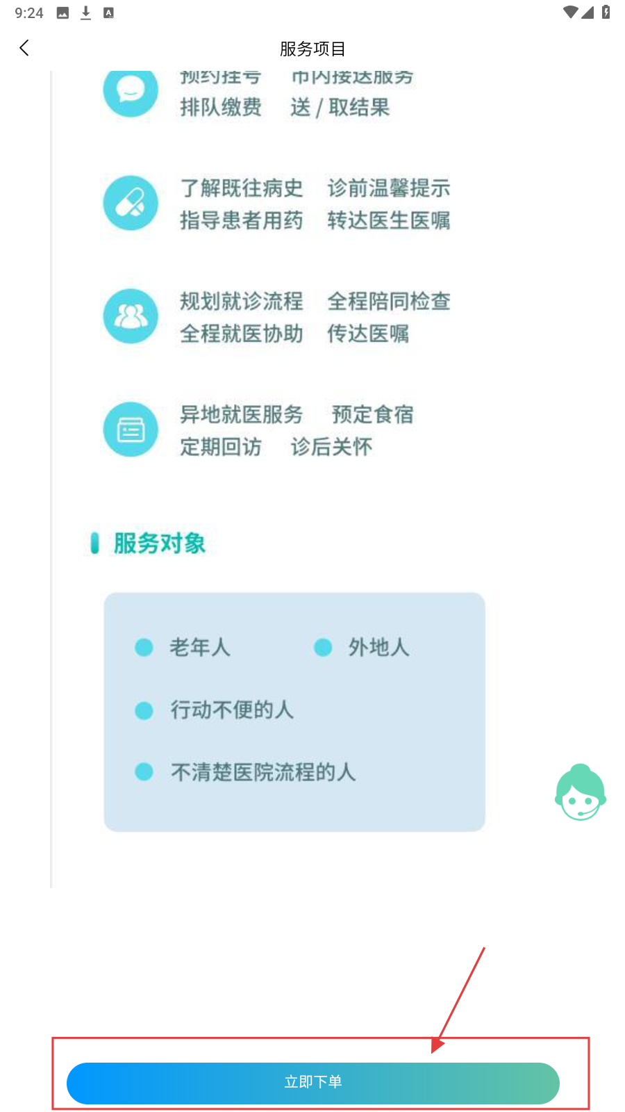 4、了解服务详情后,若满意可点击【立即下单】按钮,完成服务预约。
