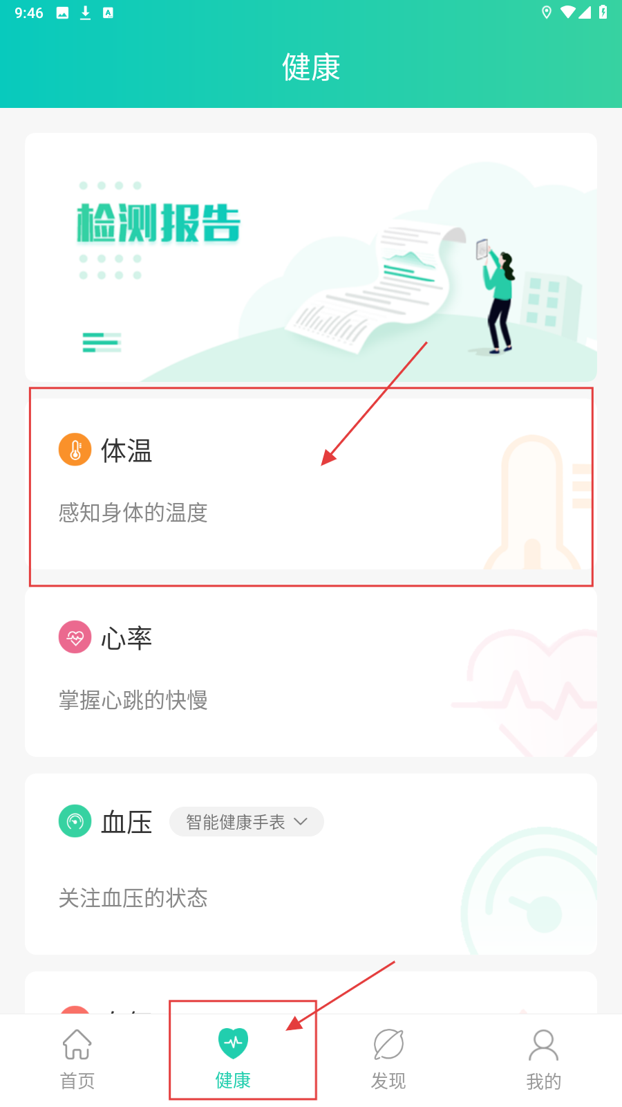 1、进入【健康】页面,可查看体温、心率、血压等健康检测选项,点击可查看详情。