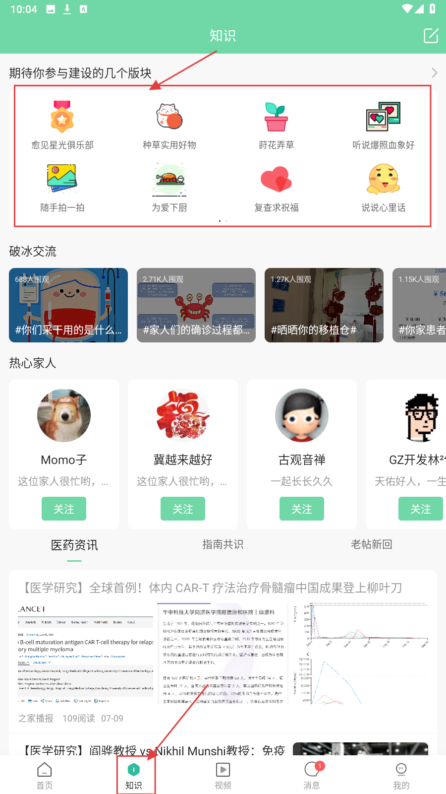 1、进入【知识】页面,可参与【愈见星光俱乐部】【种草实用好物】等板块建设,分享内容。