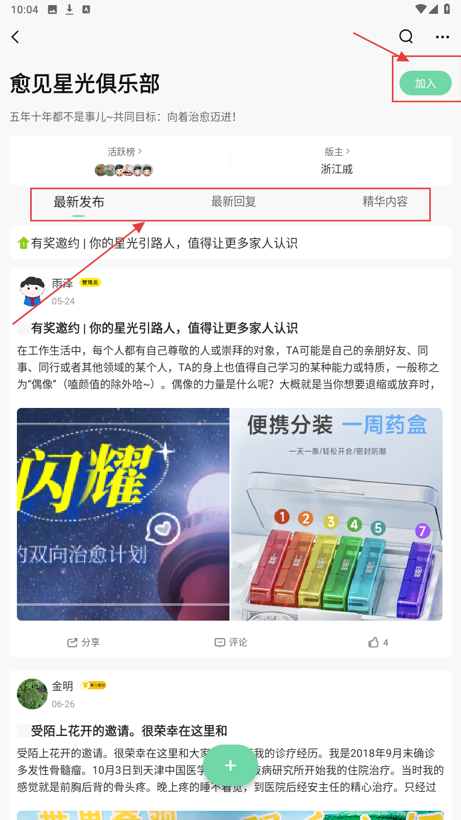 2、在【愈见星光俱乐部】,点击【加入】可参与讨论,还能按【最新发布】等查看帖子。